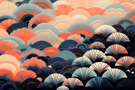 A collection of colorful paper fans with a floral design. The fans are arranged in a way that creates a sense of depth and movement. Scene is one of elegance and sophistication