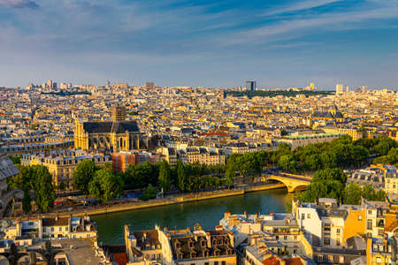 High resolution aerial panorama of Paris, France taken from the Notre Dame Cathedral before the destructive fire of 15.04.2019. The river Seine. Aerial view of Paris at sunset. Paris, France.