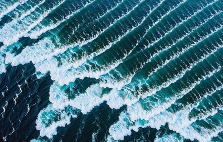 The majestic beauty of the ocean as viewed from a drone, showing the detailed textures and forms of waves crashing into the sea from a top view perspective.