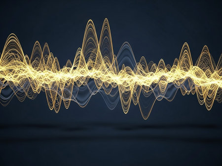 An abstract visualization of oscillating yellow and blue glowing lines representing sound waves or data streams...