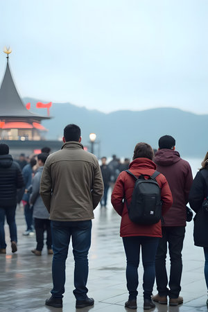 Long hair girl standing at the silver fence in the evening with sunset view while her friend take a photo.