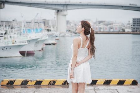 Woman enjpy view of fishing port harbor, Okinawa, Japan.