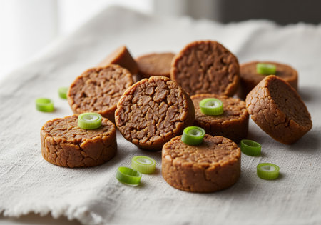Dried miso paste rounds, featuring a rich brown texture, carefully arranged on a light fabric and garnished with vibrant green scallion slices. represents japanese cuisine, fermentation, and gourmet seasoning.
