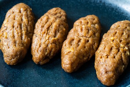 turkish food cig kofte with lemon and lettuce leaf lettuce and parsley on wood plate tray