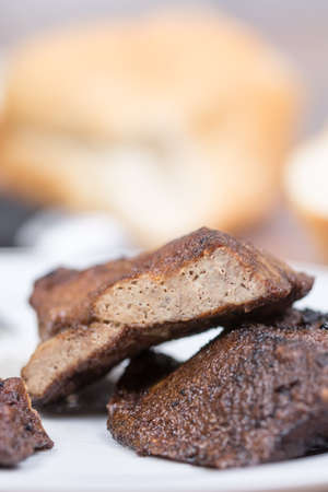 Sliced meatloaf on plate over white stone background with copy space. Top view, flat lay, close up