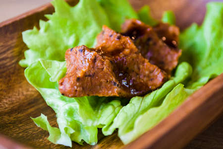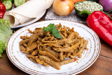 Vegetarian spicy Shawarma meat imitation made from grains, soybeans, vegetables and legumes
