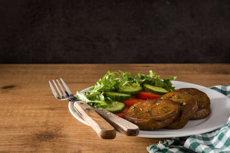 Closeup view of delicious vegan grill burgers and seitan steaks with green vegetables.