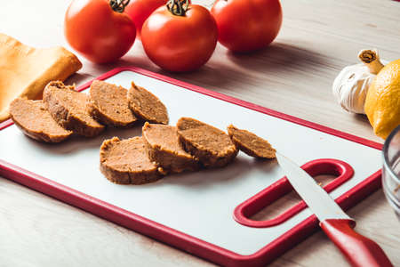 Vegan gastronomy, seitan is veggie meat. Copy space