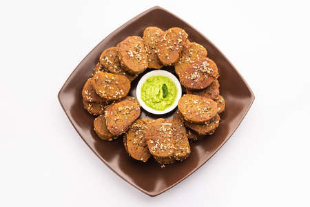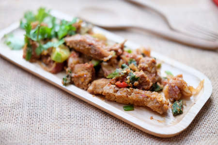 Thai cuisine of fried fishcake (Tod Mun Pla) on wooden dish