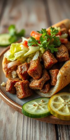 Savory grilled meat with fresh vegetables served in a warm flatbread on a rustic wooden table