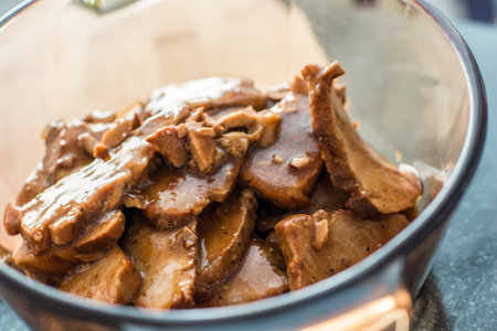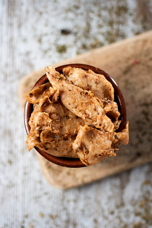 high angle view of some cooked mock chicken strips in a earthenware bowl, placed on a rustic wooden table