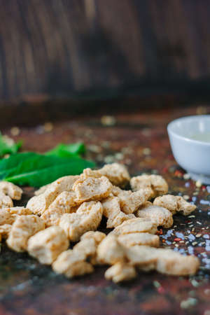 closeup of some cooked strips of spiced mock chicken meat in an earthenware plate, on a rustic wooden table