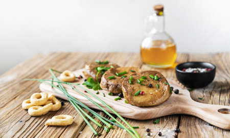 Seitan stakes with spices, olive oil, fresh leek, tarallucci on cutting board