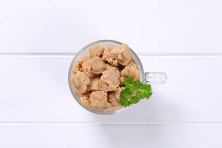 Ready to eat soy balls made of soya beans, alternative for meat. Soya chunks in bowl on white background.