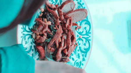 Hands chef put slices of beef tenderloin on a plate of arugula. Side view, black background, close up