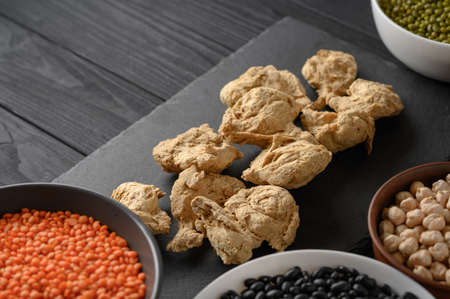 Soy meat and legumes, overhead flat lay shot on a dark rustic wooden background