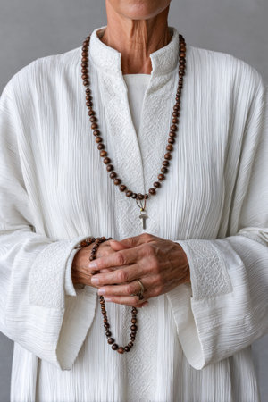 Senior nun wearing white robe holding rosary beads and praying, demonstrating faith and devotion