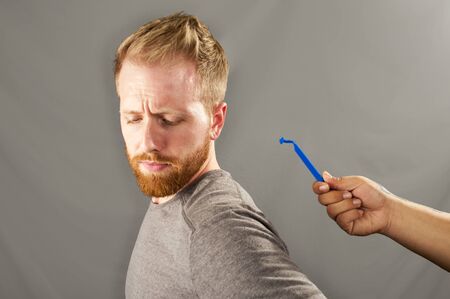 Young man showing HELP sign clutching flank for urinary pain or nephrolithiasis