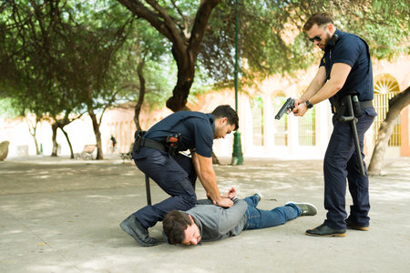 Caucasian cops using their guns while making an arrest of a violent criminal suspect after a chase outdoors