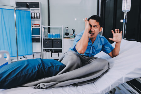 A man with a severe headache holds his head in his hands, his face contorted in pain, and blurry, distorted light streaks through the image, creating a sense of disorientation and anxiety.