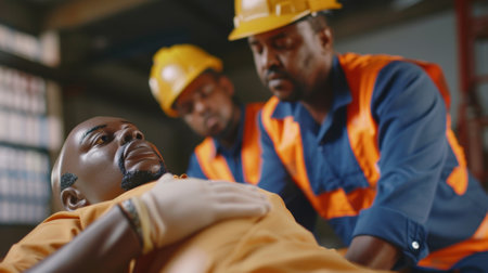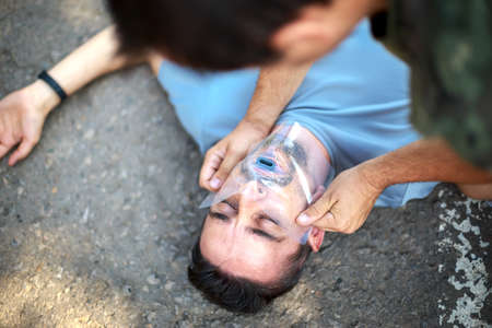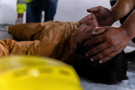 Establish an airway, Life-saving and rescue methods. Accident at work of electrician job or Maintenance worker in the control room of factory.