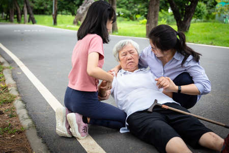 Sick asian senior mother with heat stroke,high temperature,vertigo on floor after falling down,daughter,granddaughter to help,take care of elderly fell faint,exhausted,suffering from illness,sunburn