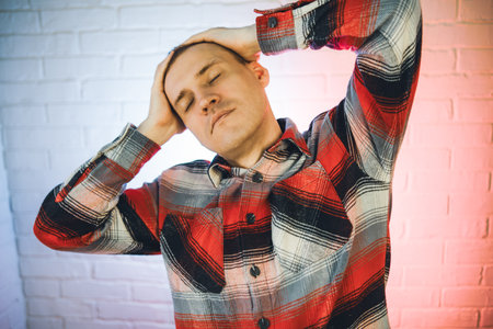Man in Plaid Shirt Dancing in Front of a Brick Wall.