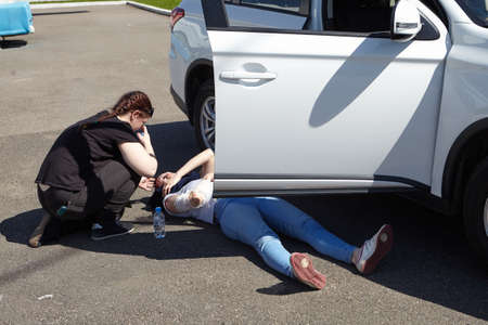 St. Petersburg, Russia - May 12, 2018: contest / exercises on first aid at the pre-hospital stage. The girl assists the driver at the car.