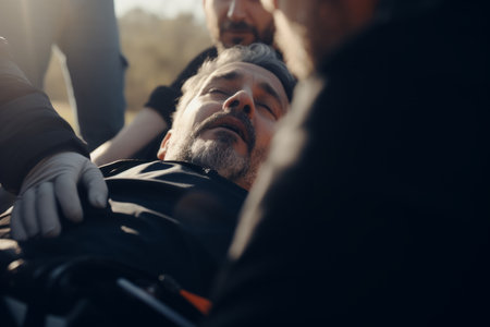 Vigilant responders swiftly transport a casualty along a leaf-strewn avenue, capturing the urgency of autumn's changing season with a softly blurred emergency vehicle
