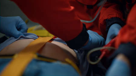 Closeup male patient lying on stretchers in ambulance car. Tired man having pain in stomach. Unrecognizable paramedics in medical gloves providing firs aid help to victim on stretchers. Rescue concept