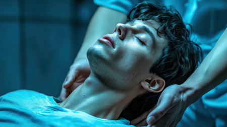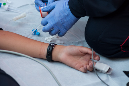 A person is receiving first aid for poisoning in a clinical setting, emphasizing urgent care