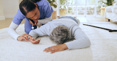 Fall, accident and senior patient with nurse and checking in a hospital with injury and caregiver support. Elderly care, emergency and floor with person in pain with healthcare professional help