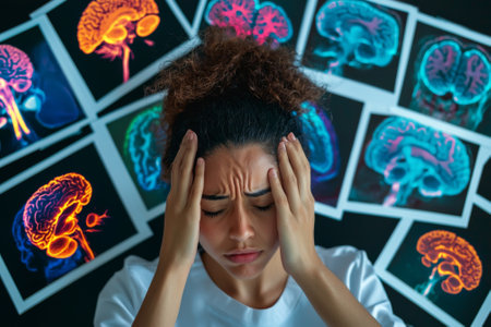 A young woman expresses distress while surrounded by colorful brain illustrations.