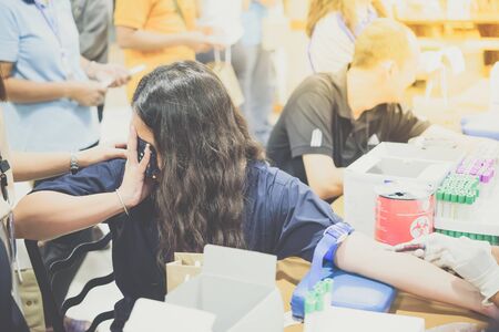 Unidentified Asian woman health check by blood test every year by the Ministry of Health.