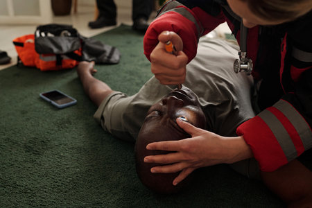 Paramedics providing first aid with medical tools in living room setting while unconscious person lying on floor, showcasing medical emergency response techniques in home environment