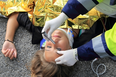 Medic checking unconscious person with flashlight, applying first aid to the bleeding person on the road after the accident on the pedestrian crossing