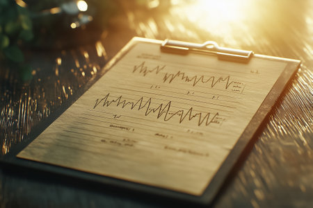 The vintage clipboard shows heartbeat patterns, bathed in sunlight's warm glow on the wood.
