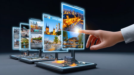 A hand interacts with floating display screens showcasing vibrant cityscapes. This image represents the fusion of technology and urban exploration in modern design.