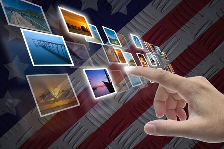 Hand selecting business icon on united state of america nation flag abstract background.
