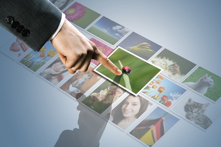 futuristic display:man hand reaching images on the screen