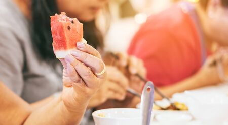 A piece of watermelon in the hand of an old woman while talking at a dinner party.