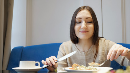 Business woman eating salad and talking on the phone in a restaurant on the background of a light wall. Lunch break in the cafe.
