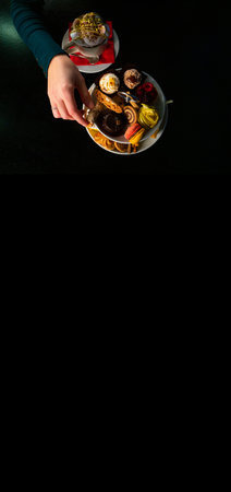 vertical high angle of a graceful female hand selecting a delicate pastry from a tray, isolated against a black background. The minimalistic composition features ample copy space, making it perfect for advertising, editorial use, food blogs, or promotional materials focused on elegance, indulgence, and fine dining