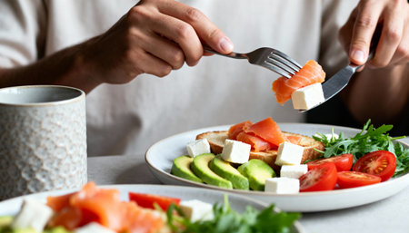 Close-up of a young man eating healthy breakfast with avocado, tomatoes, cheese and salmon