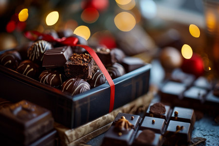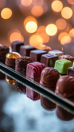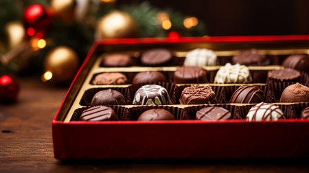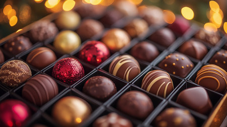 Close-up of gourmet chocolates in a festive box, adorned with holiday bokeh lighting