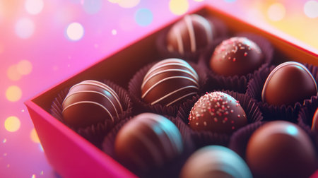 A delightful assortment of gourmet chocolate truffles beautifully arranged in an elegant pink box, surrounded by a soft bokeh background, perfect for celebrations.