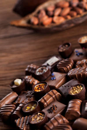 Selection of delicious chocolates on rustic background