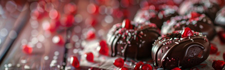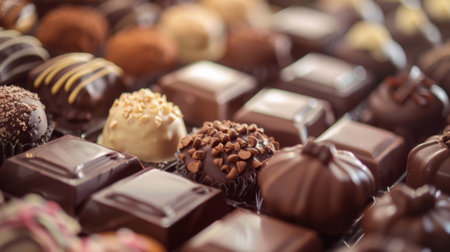 Gourmet chocolates are arranged artistically, showing rich textures and delightful flavors.