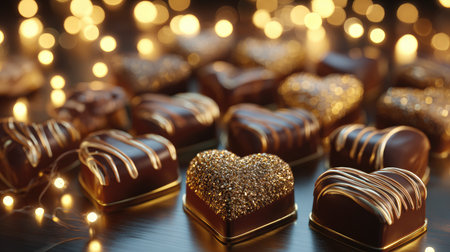 A stunning arrangement of heart-shaped chocolate candies adorned with golden accents, beautifully contrasted by soft glowing lights, perfect for romantic occasions.