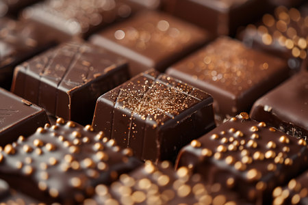An AI generated illustration of A close-up shot of an assortment of dark chocolate candy laid out in a neat row